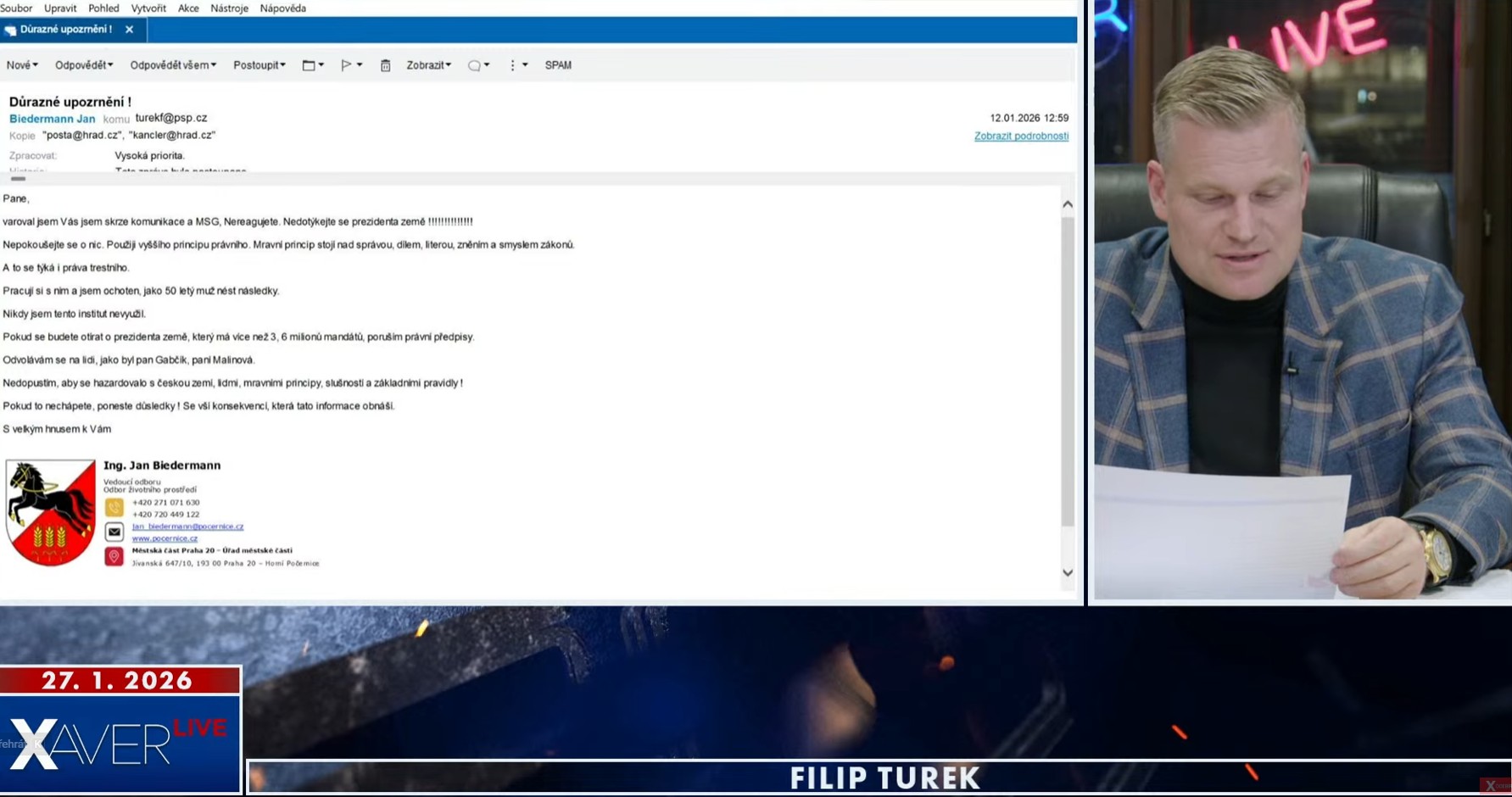 Mimo jiné zmínil konkrétní mail, který obdržel na začátku ledna od člověka, který pracuje jako vedoucí odboru životního prostředí na radnici pražské městské části Horní Počernice. Dvanáctého ledna ve třináct hodin, tedy v pracovní době, mu z pracovní schránky zaslal mail, jehož kopie šla i na Hrad. „Nedotýkejte se prezidenta země. Nepokoušejte se o nic. Použiji vyššího principu právního. Mravní princip stojí nad správou, dílem, literou, zněním a smyslem zákonů. A to se týká i práva trestního,“ pohrozil.