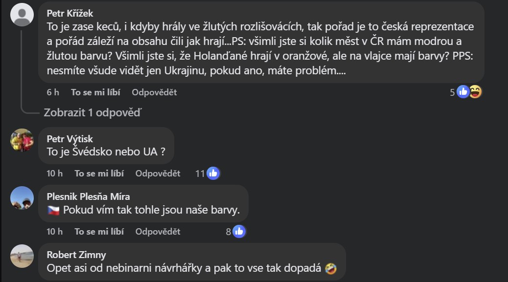 „To je zase keců, i kdyby hrály ve žlutých rozlišovácích, tak pořád je to česká reprezentace a pořád záleží na obsahu čili jak hrají… PS: všimli jste si, kolik měst v ČR má modrou a žlutou barvu? Všimli jste si, že Holanďané hrají v oranžové, ale na vlajce mají jiné barvy? PPS: nesmíte všude vidět jen Ukrajinu, pokud ano, máte problém…,“ pokusil se Petr o vysvětlení.